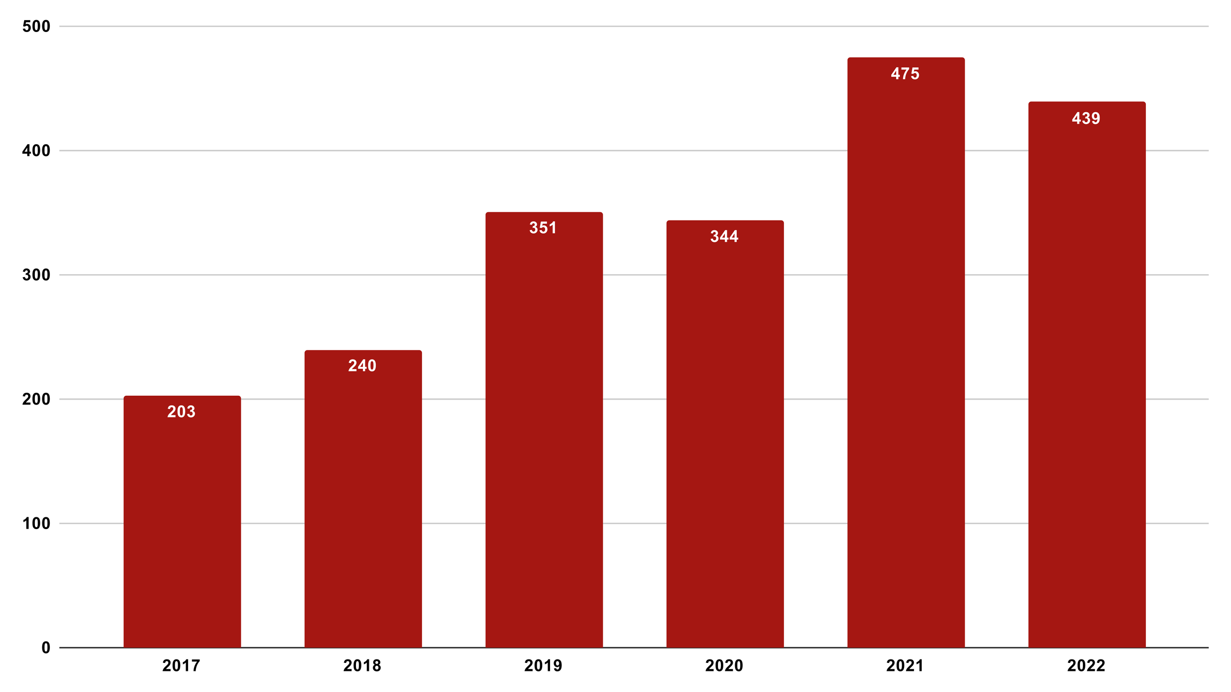 351 interns, 62 graduates and 26 contractors were hired at 115 organisations in 2022. Successful candidates were from 30 tertiary institutions. If you compare this graph with the “applications” one above, you can see there's no talent shortage. We have approximately 10:1 applicants for the roles available: